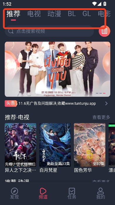 1.打开豚豚剧app,点击“频道”选项,选择自己喜欢的电视剧、电影等。