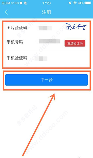 最后在注册界面,输入要注册的手机号码和验证码,并点击下一步完成注册即可。