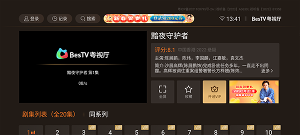 粤视厅会员是由BesTV粤视厅推出的一项视频会员服务,可享受带有“vip”角标节目的多种观影特权。会员权益包含丰富的会员专享内容、优质高清剧集,会员尊享身份,免广告特权等专属特权,畅享海量港剧。