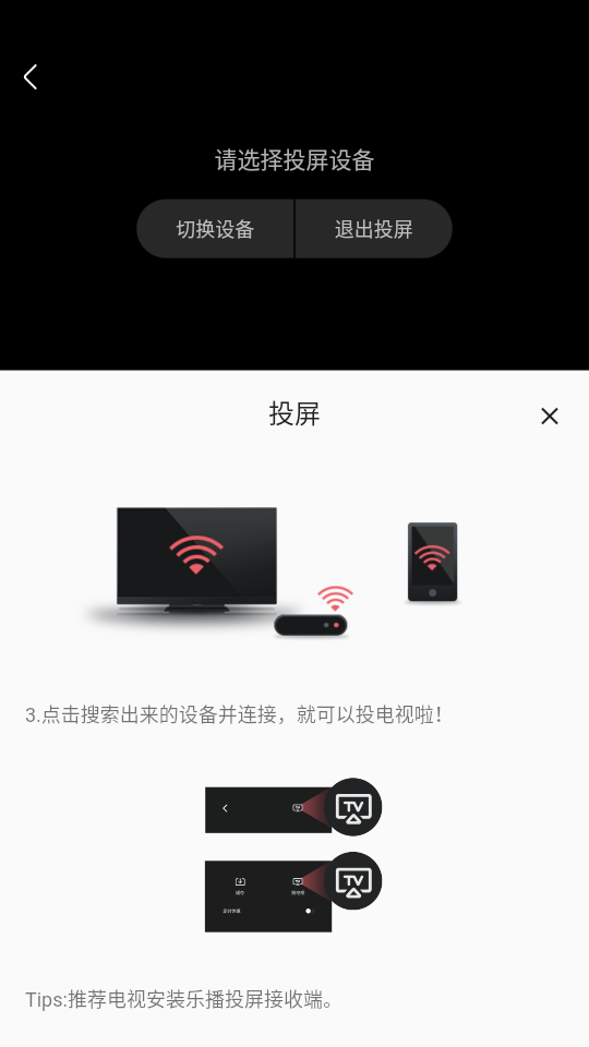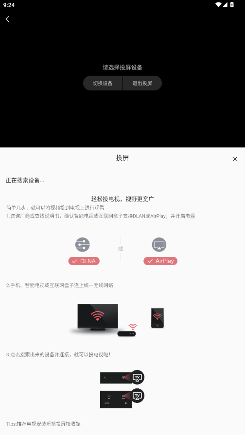 3、确认智能电视或互联网盒子支持 DLAN或AirPlay,并开启电源,手机、智能电视或互联网盒子连上统一无线网络,点击搜索出来的设备并连接,就可以投电视啦!