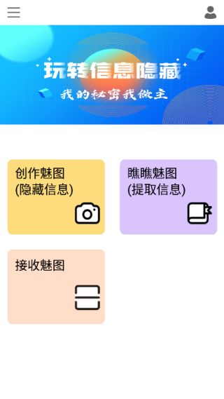 1、主界面集成三大核心功能:创建加密图片、浏览加密内容、接收加密文件;