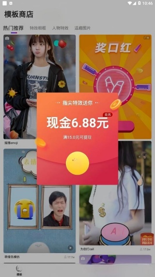 1、首页提供拆红包领奖励功能,同时模板商店内置海量创作模板供用户选择使用;