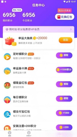 3、任务中心设置多样化任务体系,用户完成任务可获得积分并快速兑换现金红包;