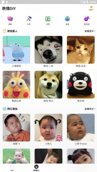 2、表情diy专区包含换脸特效、斗图生成、动态表情、追星素材及套路图等创意功能;