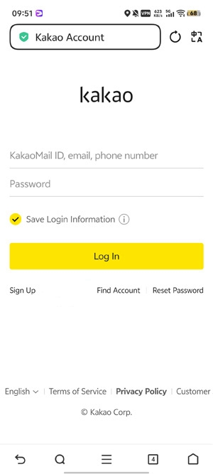 3、输入你的Kakao账号和密码,点击登录按钮,即可完成注册流程。