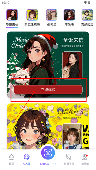 4、在AI绘画页面,可选择圣诞版、宫崎骏版、朋克涂鸦版、像素版等多种人像模板,点击喜欢的风格后选择“立即体验”。