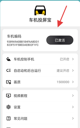 3、应用界面上方显示应用名称与图标,下方清晰展示车机编码(由数字和字母组成),右侧明确标注“已激活”状态,表明投屏功能已成功启用。