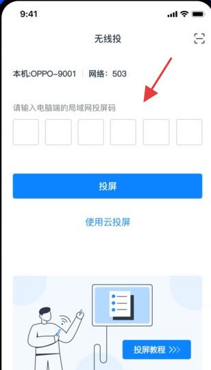 1、界面顶部显示本机信息及当前网络状态,中间设有输入框,提示用户输入电脑端生成的局域网投屏码,下方提供一键投屏按钮。