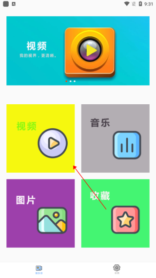 1、打开星辰影院应用后,可进入视频、图片、音乐或收藏等模块,此处以视频频道为例进行操作说明。
