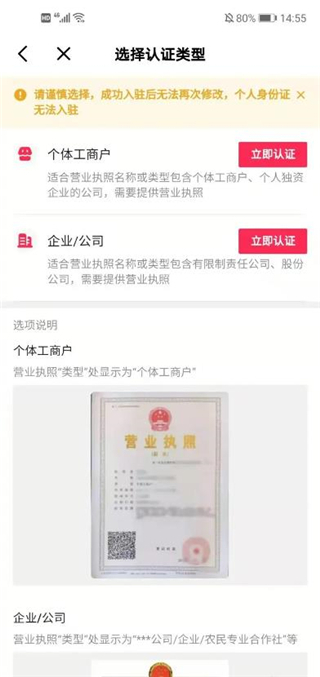 5、授权登录巨量引擎账户后,选择相应的认证类型,个体工商户或企业均可。如尚未办理营业执照,建议提前准备好身份证照片,并确认好店铺名称、注册资本金、股东资料等相关信息,前往当地工商局或网商云谷等第三方服务平台办理执照;