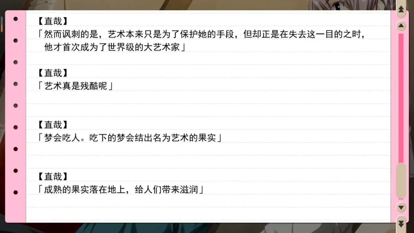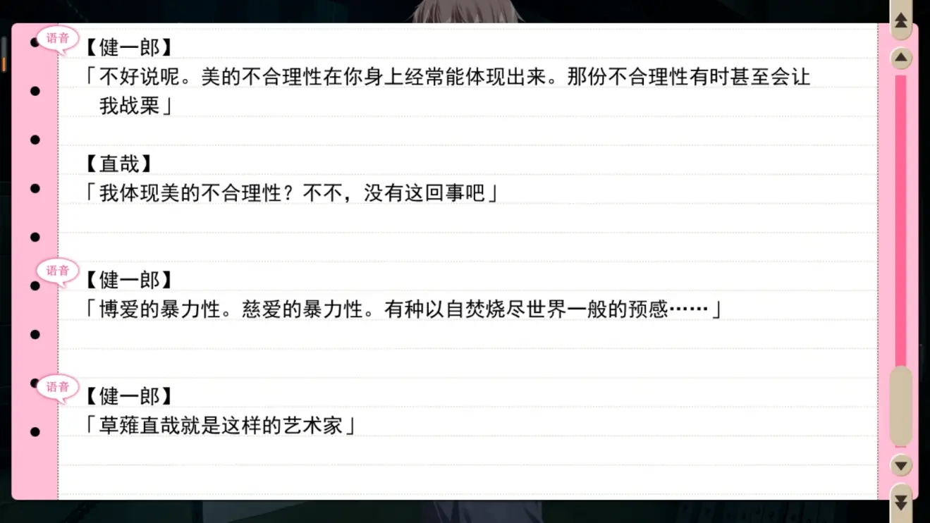 亘实际上在游戏中起到了一个“提示主旨”的作用(笑、语文阅读警告)。开篇出现在玩家眼中的是一个无厘头社长的形象,但是他心中一直有着使遗作复苏的愿望,这实际上就是提示了玩家要注意“艺术”的本质。共通线便提到的“作品是为何而诞生,为何而创作”与第六章中提到的一模一样的话,表现了他们作为艺术热爱者的觉悟。从这一点来看,说亘是直哉的弱化版也不为过。反倒因为更早地前置主题,使得整部游戏的发展脉络很是清晰。