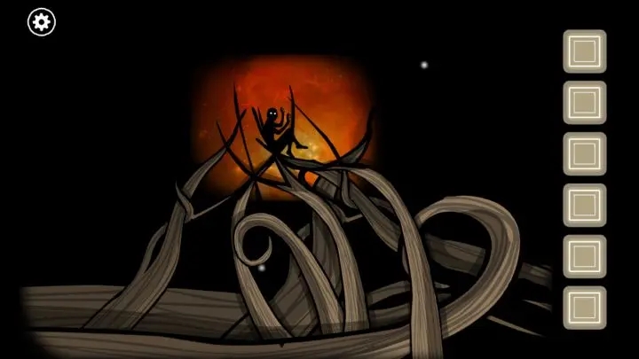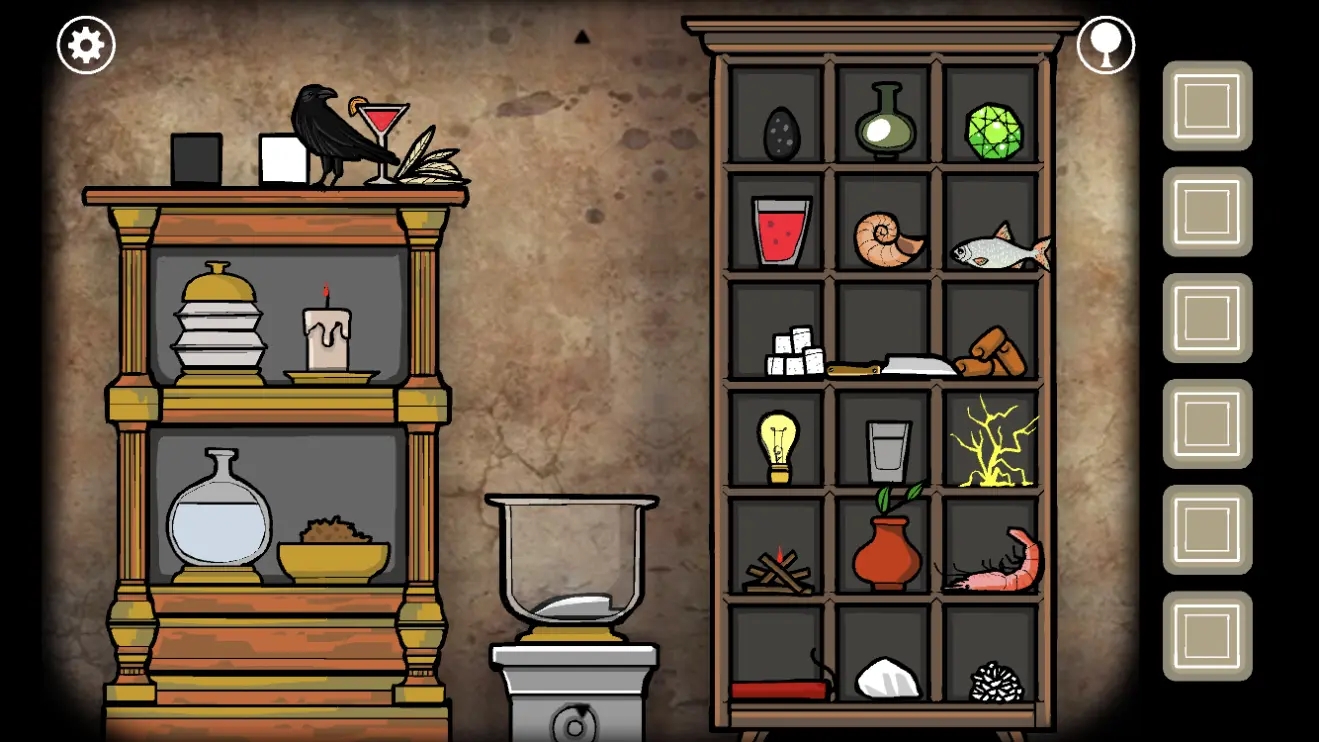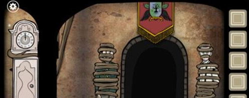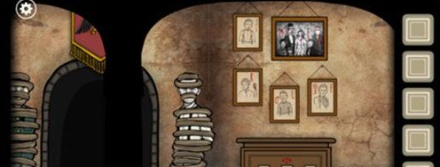 根据提示将书柜上的雕像按「兔子、鸽子、野猪、乌鸦、鹿、鸟」的顺序摆放,移动上下两排的书籍,根据书上图案的提示摆放至正确的位置后激活机关。然后点击出现的暗门,进入下一关