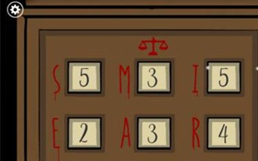根据墙上的画J-1-舌头;F-3-毛发,这是两个已知的,进到门里面,我们根据密码柜子上的天平提示把所有的瓶子都放平,如图,这样我们就知道密码了,因为舌头=1舌头放在了数字5的托盘上,所以总和为6,6也是所有托盘数字+瓶子数字的重量,所以算出眼睛=I=S=5;脚=3=L;眼泪=2=E;牙齿=3=M;血=4=R;大脑=3=A,打开柜子获得最后的心脏(柜子里也提示了总和为6啊)