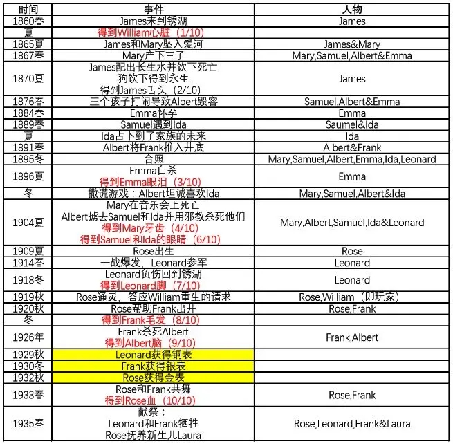 在故事发展中收集了十个祭品,最后Leonard、rose和Frank同聚一堂,来到祖父James以前研究其叔叔长生药时的底下实验室,随后将祭品放入瓶子中,三人被树根缠住。接着十样祭品的养分融合到心脏中,原来是Willam(James的叔叔)。最后除了rose其余人都死去,而rose抱着一个婴儿站在锈湖中,故事结束。