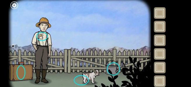 点击James胸前口袋里的信纸,打开后获得密码提示「572」。再打开地上的箱子,拿走里面的「骨头」和盒子里的「种子」。接着将骨头递给狗狗后再将种子放入坑中,然后拿走右边的「水壶」。利用水井将水壶打满后将水倒在种子上,完成后点击James进入下一关。