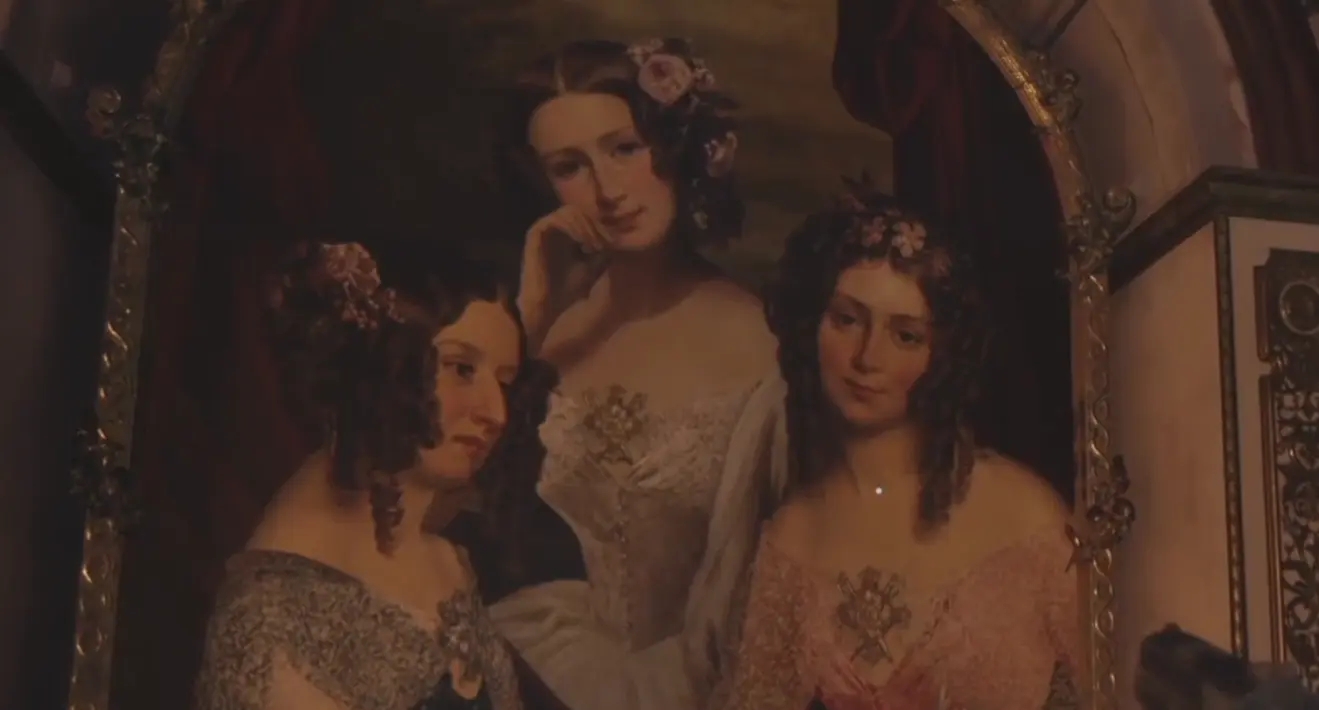 来到城堡大厅,看到美丽的三姐妹的画像,桌上有文件【访客名册】。