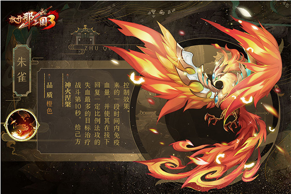 技能简评:作为辅助型神兽,朱雀的免控增益是一大亮点,在队伍奶量较为欠缺的情况下或是开场即面临强控的作战场合中可以提高我方低血量武将的生存能力。由于技能释放时间限制在开场后第10秒,想要令该技能效果理想发挥,需要多多注意敌我双方技能的释放时机。
