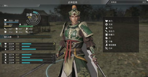 武将强化:人物每升一级能获得3点强化点数,玩家可以自由分配。本作中所有属性都是有上限的,如果加满,后期装备终极武器和饰品等会造成溢出,所以建议先装好武器饰品后再来加点。