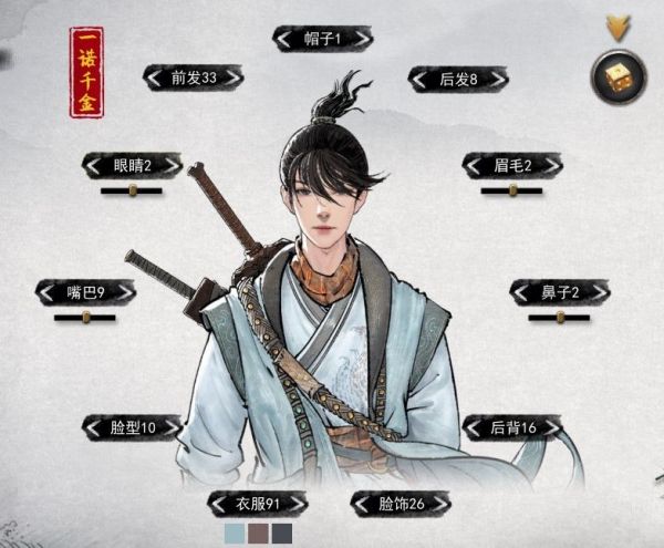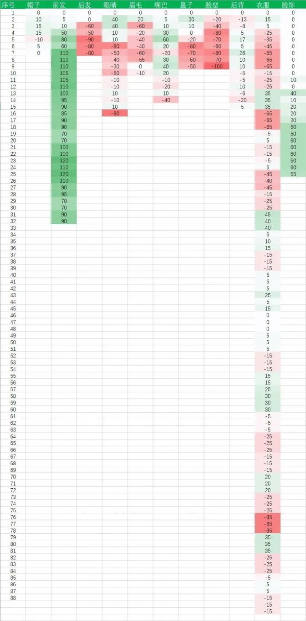 帽子1、后发8、眉毛2、鼻子2、后背16、脸饰26、衣服91、脸型10、嘴巴9、眼睛2、前发33。