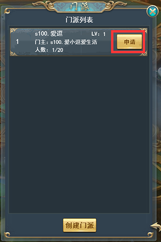 2、找到自己喜欢的门派点击【申请】,就可以等待门主审核通过啦~