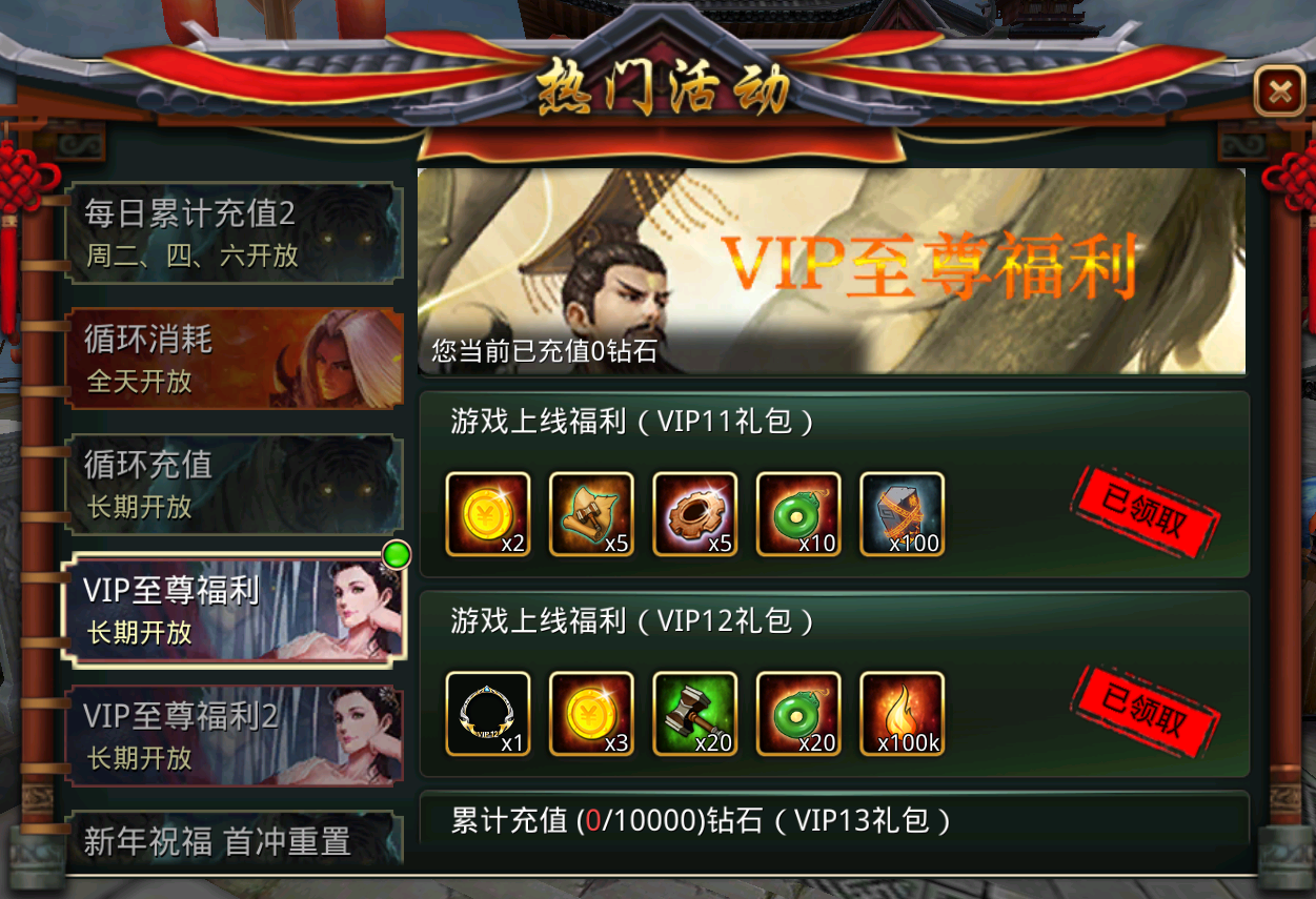 1.上线直达VIP12!钻石28888!!12档VIP礼包福利,超值福利拿到手软!
