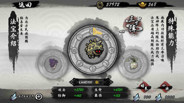 试炼一的瑶姬和试炼三的柏高,先把这两点拿出来,因为他们的效果在功能上不依赖于其他任何法宝,怎么搭配他们效果就是这样,瑶姬用来刷钱刷魂一级棒,柏高破霸体加快,缩短boss战时间免得夜长梦多被反杀,是相当不错的法宝,而且入手简单。
