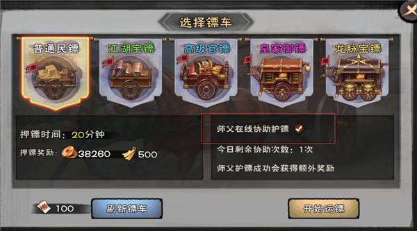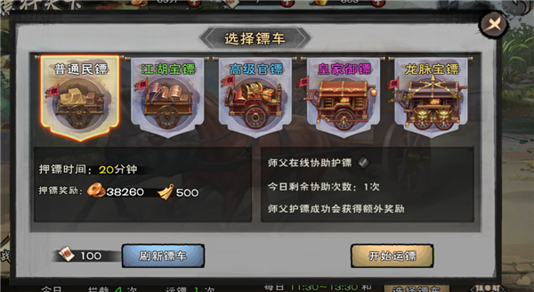 等级越高获得的奖励更加的丰富,但刷新镖车需要用银票,而且还有可能刷回低等级,所以少侠们还是在银票充足的情况下去刷新镖车哦。