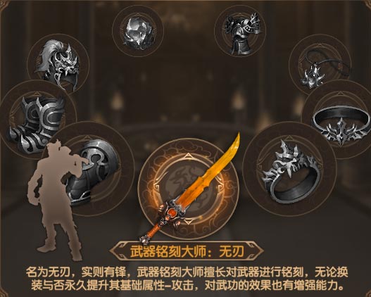 铭刻大师在玩家10级时开启,是对装备进行铭刻的功能。俗话说:工欲善其事,必先利其器。可见对装备的铭刻显然是十分必要的。铭刻大师共有九位,也面向了我们的九件装备:武器-无刃,戒指-灵眼,腰带-载地,项链-容天,衣服-金刚,灵物-心海,头盔-不动,鞋子-如风,护腕-疾闪。九位大师通过铭刻的方式,除了可以大幅提升对应装备部位的基础属性,还会赋予玩家对武功和门派的针对性,使你的武功效果更进一步。