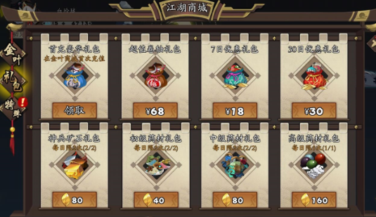这大概是平民玩家最关心的问题了,最初通关送的金叶子首先要留下来买少林英雄令,大部分玩家已经心照不宣了,至于为什么买少林英雄令而不是其他这会在之后细讲。买完英雄令后金叶子的主要用途(仅仅针对平民)在于买药材礼包(看起来紫色最值,但推荐买蓝色),和抽卡。