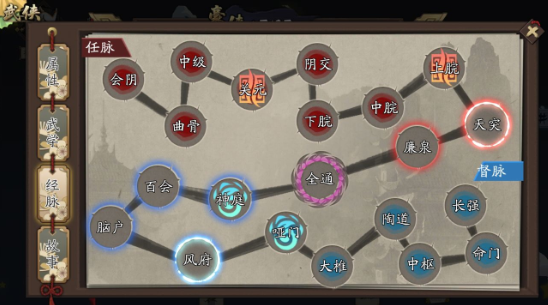 角色经脉也并非要一味全升(土豪无视),显而易见,升级任脉可以提升角色所带卡片等级(并不与副本里的升级冲突),督脉则提升角色技能(还有一点点零碎的金钱食物防御),督脉所需药材比任脉多一些。