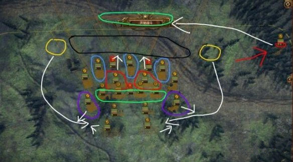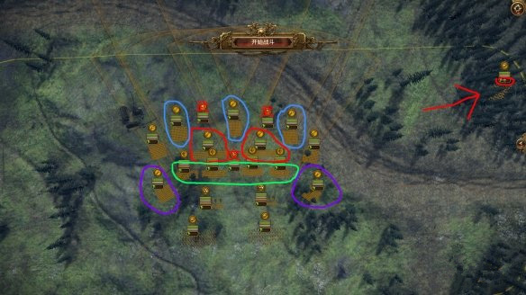 绿圈弓箭步放后排,前期能受到步兵保护不被敌人骑兵骚扰。紫圈侧翼两队枪兵防止对方骑兵绕后偷袭。阵地战一定记得关掉弓兵自动回避,必要时打开坚守以防止弓兵追逃时走出保护范围。