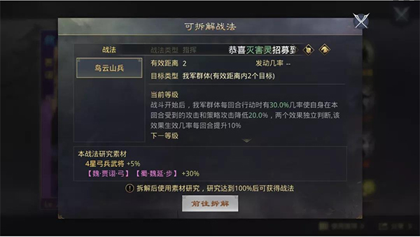 为武将学习更多战法,能让部队的实力大大提升。战法可通过拆解武将卡获得,但注意:拆解获得的战法还需要消耗指定武将卡进行研究才能学习。