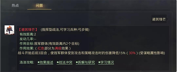 在这里笔者需要提醒玩家,鸟云山兵与避其锋芒存在一定的冲突,但这种冲突是“豪华型选择”的结果,与“垒实+健卒”两个豪华型五星战法最大化保障前锋生存能力的选择是类似的,避其锋芒与鸟云山兵的搭配会让队伍在前三回合享受避其锋芒的高额减伤。