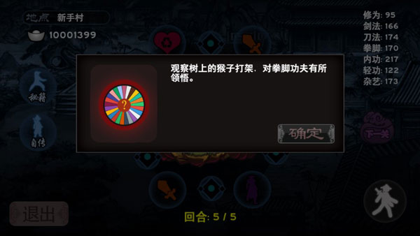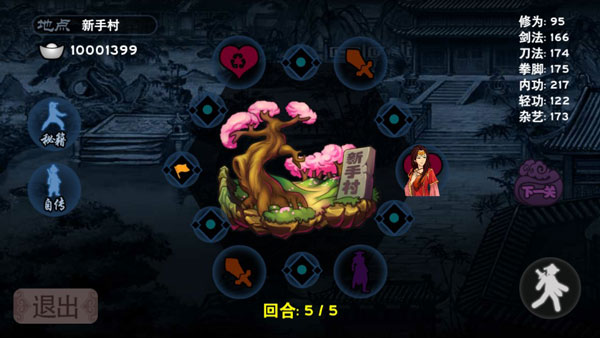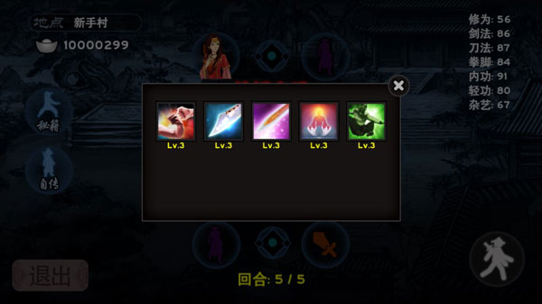秘籍可在宝箱中获得,主要分为拳法、剑法、刀法、轻功和内功五种,通过修为可进行升级,最多可升到5级,能够为你带来不错的属性提升。