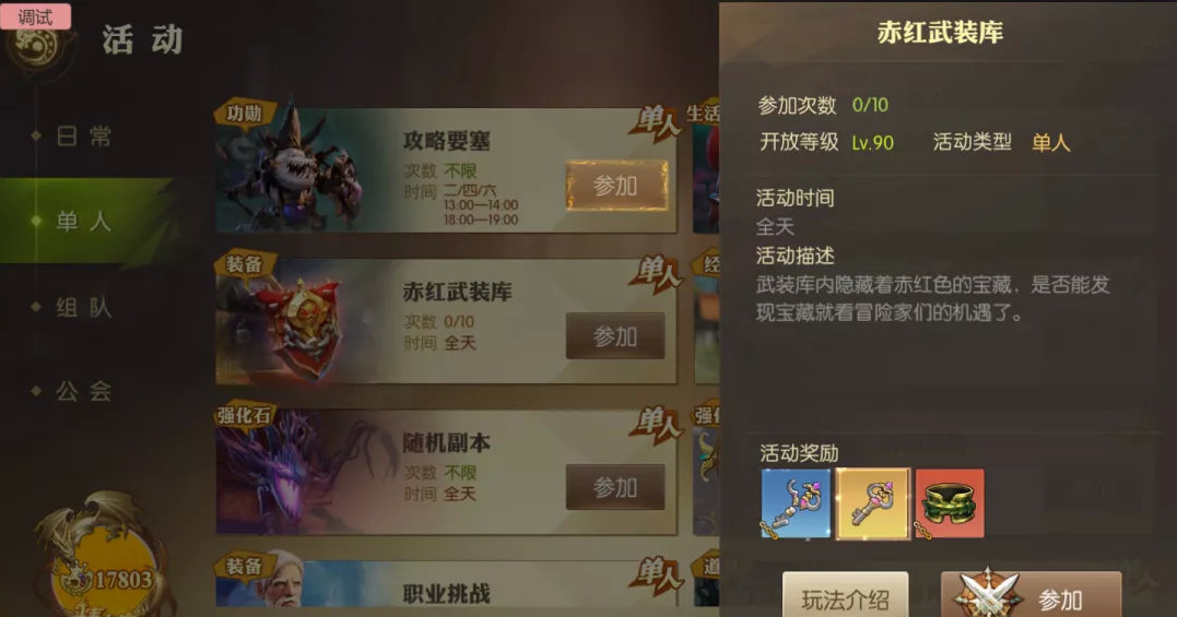 冒险家达到90级后,就可以在【活动】界面前往赤红武装库啦~每天可以进入副本十次。