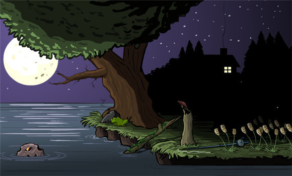 第1关先点大树上的树枝掉下来,然后再点树枝,=虫子爬到青蛙面前点青蛙,在点树上的鸟洞,点鸟刚才落在的树墩,在点鱼竿,之后点一开始掉下来的陨石,在点虫子,之后再点鱼竿点3下,过。